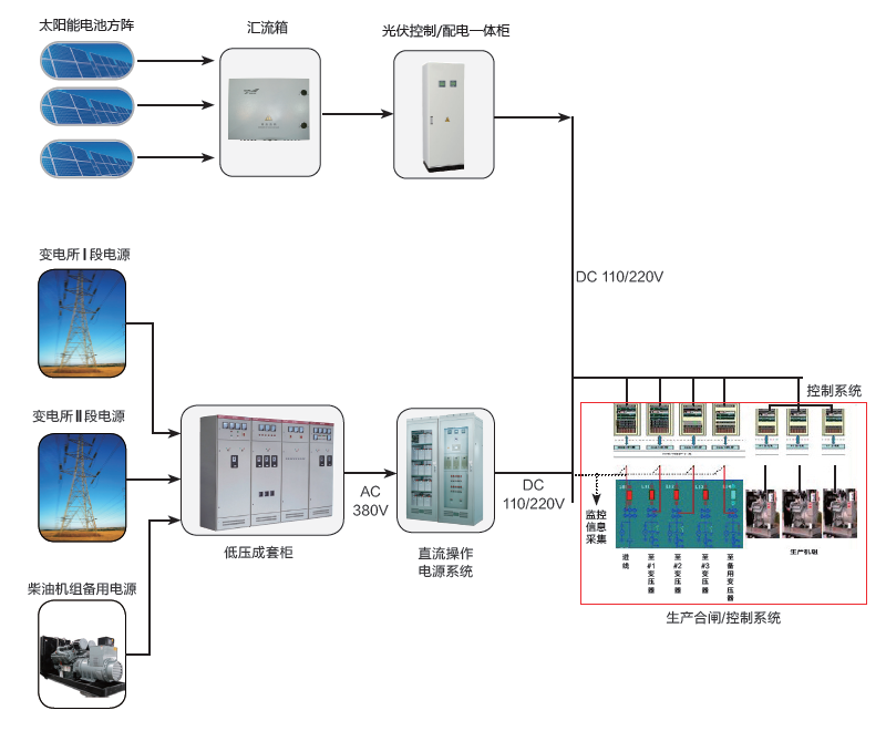 ● 系统简介:在电厂保护供电源的基础上,接入光伏发电的系统,给系统电源增加一份保障的同时节约电能。 ● 系统组成:由电厂拉合闸及控制保护电源系统、太阳能电池方阵及支架、汇流箱、太阳能控制配电一体柜、防雷、监控等组成。 ● 解决方案:深入研究电力应用环境,在充分发挥我司在电力系统的专业优势的同时,并入新能源节能一体化解决方案。为供电系统改提供节能方案的同时增加了一份安全保障。